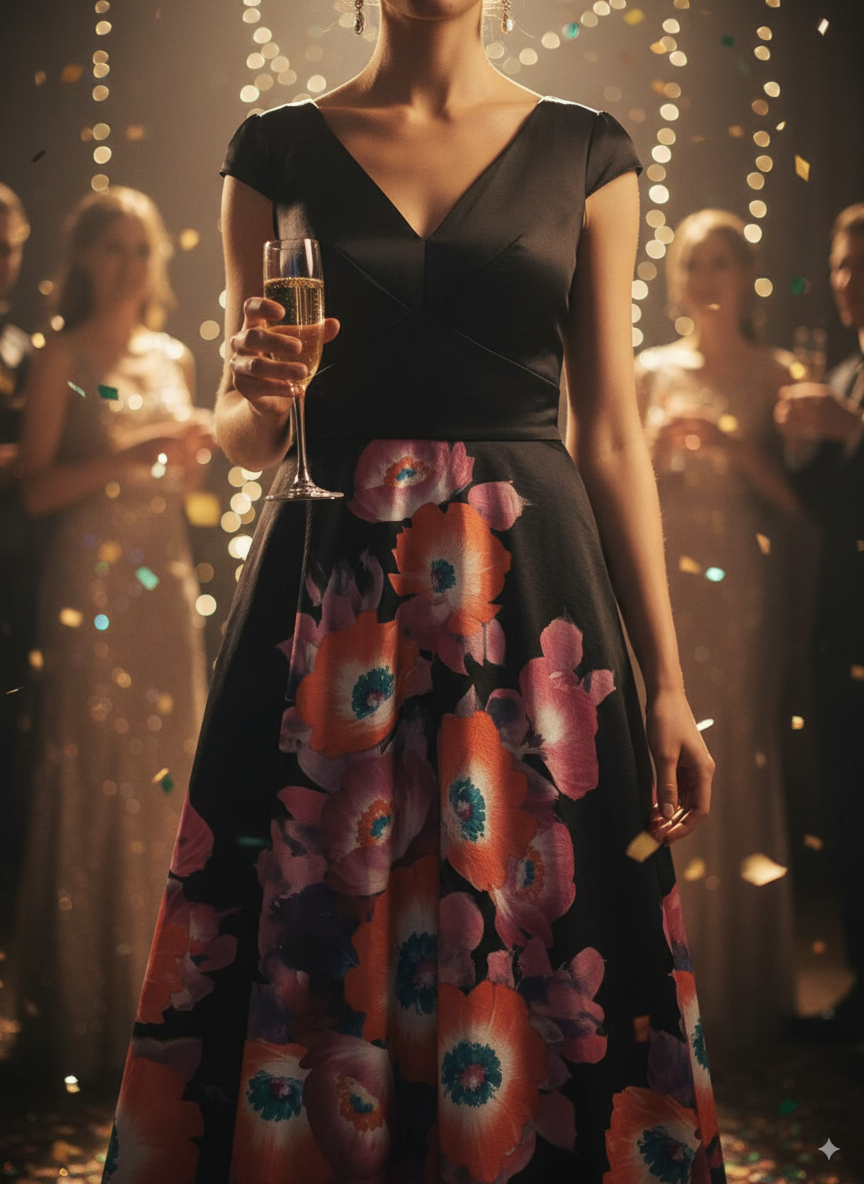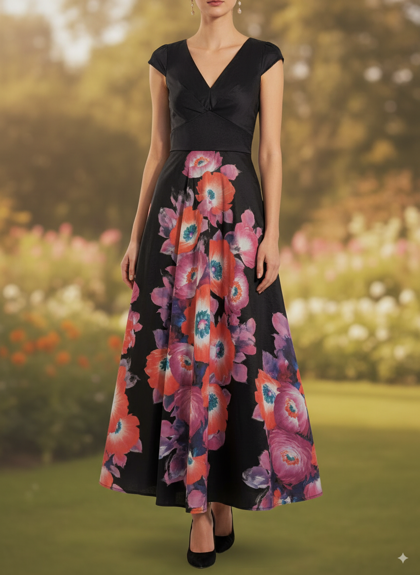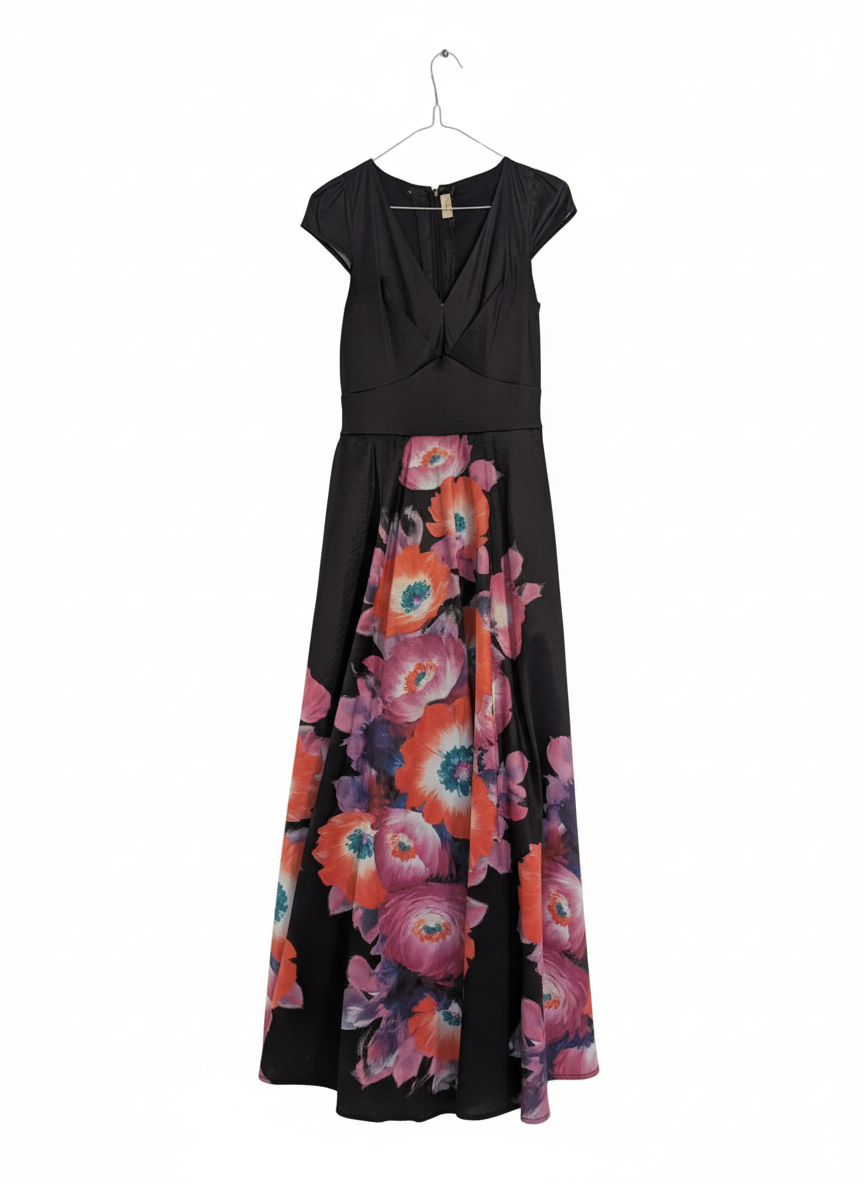 Este elegante vestido presenta un corpiño negro entallado con cuello en V y mangas cortas, complementado con una falda larga de silueta A que florece con un vibrante estampado floral en tonos rosados, naranjas y morados. Es la elección perfecta para un evento formal o una celebración especial, destacando por su sofisticación y toque de color.